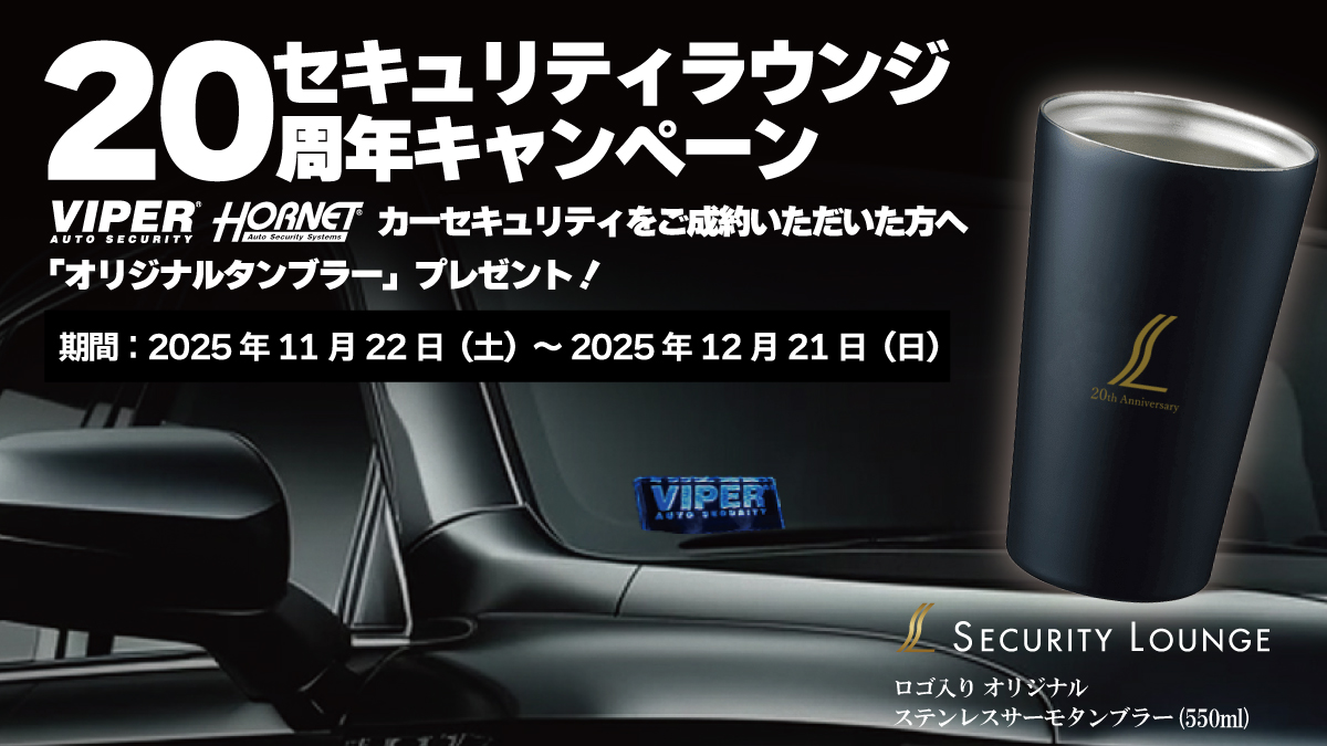 内容:期間中に全国のセキュリティラウンジでVIPERカーセキュリティ/HORNETカーセキュリティをご成約いただいた方に、もれなく「20周年記念セキュリティラウンジロゴ入りオリジナルステンレスサーモタンブラー」をプレゼントいたします。